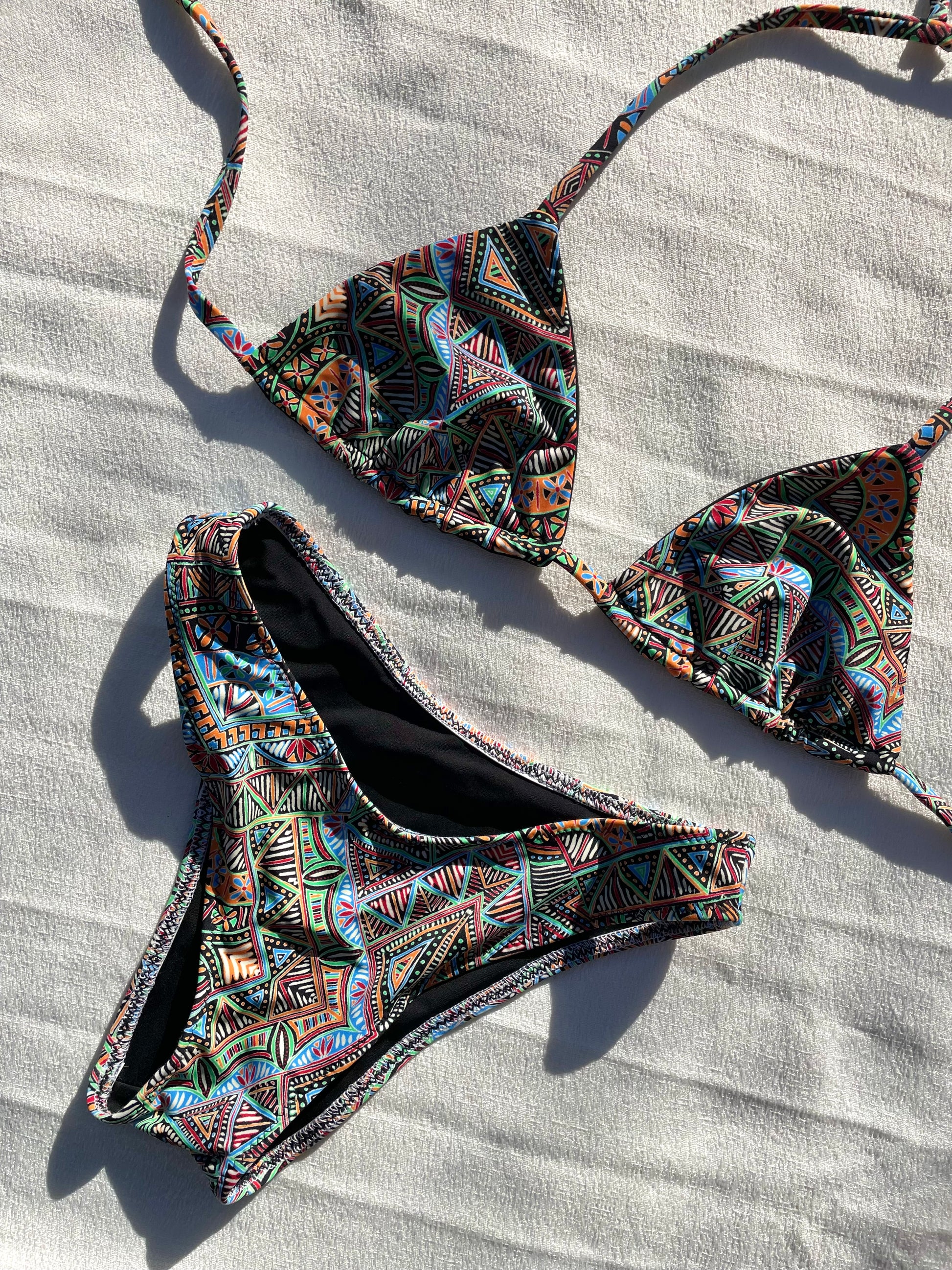 This bikini features a multi-coloured ge0metric tribal-inspired pattern that makes a true statement. Vibrant lines and shapes come together to create a fun, adventurous look- ideal for the free-spirited beachgoer who loves to stand out.